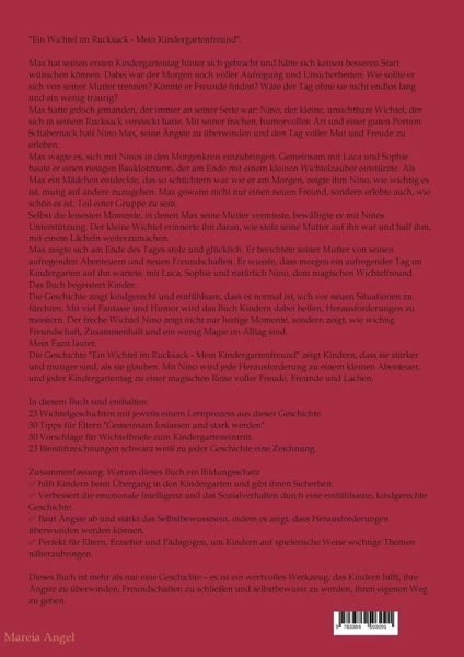 Ein Wichtel im Rucksack - Mein Kindergartenfreund.Max hat seinen ersten Kindergartentag hinter sich gebracht und hätte sich keinen besseren Start wünschen können. Dabei war der Morgen noch voller Aufregung und Unsicherheiten: Wie sollte er sich von seiner Mutter trennen? Könnte er Freunde finden? Wäre der Tag ohne sie nicht endlos lang und ein wenig traurig?Max hatte jedoch jemanden, der immer an seiner Seite war: Nino, der kleine, unsichtbare Wichtel, der sich in seinem Rucksack versteckt hatte. Mit seiner frechen, humorvollen Art und einer guten Portion Schabernack half Nino Max, seine Ängste zu überwinden und den Tag voller Mut und Freude zu erleben.Max wagte es, sich mit Ninos in den Morgenkreis einzubringen. Gemeinsam mit Luca und Sophie baute er einen riesigen Bauklotzturm, der am Ende mit einem kleinen Wichtel Zauber einstürzte. Als Max ein Mädchen entdeckte, das so schüchtern war wie er am Morgen, zeigte ihm Nino, wie wichtig es ist, mutig auf andere zuzugehen. Max gewannnicht nur einen neuen Freund, sondern erlebte auch, wie schön es ist, Teil einer Gruppe zu sein.Selbst die leisesten Momente, in denen Max seine Mutter vermisste, bewältigte er mit Ninos Unterstützung. Der kleine Wichtel erinnerte ihn daran, wie stolz seine Mutter auf ihn war und half ihm, mit einem Lächeln weiterzumachen.Max zeigte sich am Ende des Tages stolz und glücklich. Er berichtete seiner Mutter von seinen aufregenden Abenteuern und neuen Freundschaften. Er wusste, dass morgen ein aufregender Tag im Kindergarten auf ihn wartete, mit Luca, Sophie und natürlich Nino, dem magischen Wichtelfreund.Das Buch begeistert Kinder.Die Geschichte zeigt kindgerecht und einfühlsam, dass es normal ist, sich vor neuen Situationen zu fürchten. Mit viel Fantasie und Humor wird das Buch Kindern dabei helfen, Herausforderungen zu meistern. Der freche Wichtel Nino zeigt nicht nur lustige Momente, sondern zeigt, wie wichtig Freundschaft, Zusammenhalt und ein wenig Magie im Alltag sind.Mein Fazit lautet:Die Geschichte "Ein Wichtel im Rucksack - Mein Kindergartenfreund" zeigt Kindern, dass sie stärker und mutiger sind, als sie glauben. Mit Nino wird jede Herausforderung zu einem kleinen Abenteuer, und jeder Kindergartentag zu einer magischen Reise voller Freude, Freunde und Lachen.In diesem Buch sind enthalten:23 Wichtelgeschichten mit jeweils einem Lernprozess aus dieser Geschichte.30 Tipps für Eltern "Gemeinsam loslassen und stark werden"30 Vorschläge für Wichtelbriefe zum Kindergarteneintritt.Zusammenfassung: Warum dieses Buch ein Bildungsschatz hilft Kindern beim Übergang in den Kindergarten und gibt ihnen Sicherheit. Verbessert die emotionale Intelligenz und das Sozialverhalten durch eine einfühlsame, kindgerechte Geschichte. Baut Ängste ab und stärkt das Selbstbewusstsein, indem es zeigt, dass Herausforderungen überwunden werden können. Perfekt für Eltern, Erzieher und Pädagogen, um Kindern auf spielerische Weise wichtige Themen näherzubringen.Dieses Buch ist mehr als nur eine Geschichte - es ist ein wertvolles Werkzeug, das Kindern hilft, ihre Ängste zu überwinden, Freundschaften zu schließen und selbstbewusst zu werden, ihren eigenen Weg zu gehen.