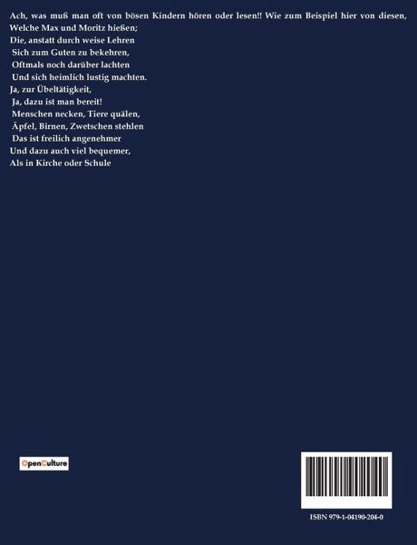 Ach, was muß man oft von bösen Kindern hören oder lesen!! Wie zum Beispiel hier von diesen, Welche Max und Moritz hießen; Die, anstatt durch weise Lehren Sich zum Guten zu bekehren, Oftmals noch darüber lachten Und sich heimlich lustig machten. Ja, zur Übeltätigkeit, Ja, dazu ist man bereit! Menschen necken, Tiere quälen, Äpfel, Birnen, Zwetschen stehlen Das ist freilich angenehmer Und dazu auch viel bequemer, Als in Kirche oder Schule