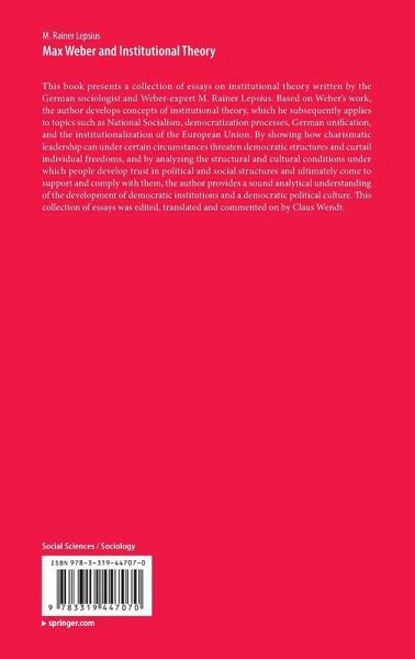 This book presents a collection of essays on institutional theory written by the German sociologist and Weber-expert M. Rainer Lepsius. Based on Weber's work, the author develops concepts of institutional theory, which he subsequently applies to topics such as National Socialism, democratization processes, German unification, and the institutionalization of the European Union. By showing how charismatic leadership can under certain circumstances threaten democratic structures and curtail individual freedoms, and by analyzing the structural and cultural conditions under which people develop trust in political and social structures and ultimately come to support and comply with them, the author provides a sound analytical understanding of the development of democratic institutions and a democratic political culture. This collection of essays was edited, translated and commented on by Claus Wendt.