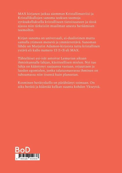MAX kirjanen jatkaa aiemman Kristallimatriisi ja Kristallikallojen sanoma teoksen teemoja syväsukelluksella kristalliseen tietoisuuteen ja tässä ajassa niin tärkeisiin maailman unesta heräämisen teemoihin. Kirjan sanoma on universaali, ei-dualistinen mutta samalla ytimeen menevä ja ymmärrettävä. Sanoman lähde on Marjutin Adamon-kirjoista tuttu kristallinen ystävä eli kallo numero 13 (1+3) eli MAX. Tähteläiset esi-isät antoivat Lemurian aikaan ihmiskunnalle lahjan, käsitteellisen mielen. Nyt tuo lahja on kääntynyt saajansa vastaan, orjuuttaen ja luoden egomielen, jonka talutusnuorassa ihminen on tuhoamassa niin itsensä kuin planeetan. Kosminen herätyskello on pärähtänyt soimaan. On aika herätä ja kääntää kelkan suuntaa kohden Ykseyttä.