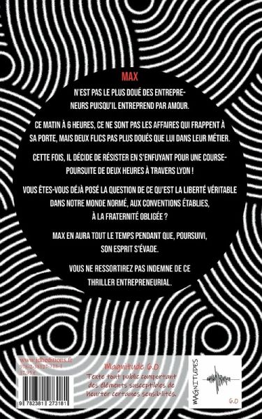 Jusqüoù peut aller la lourdeur bureaucratique quand elle s¿acharne sur un homme ? Max n'est pas le plus doué des entrepreneurs puisqu'il entreprend par amour. Ce matin à 6 heures, ce ne sont pas les affaires qui frappent à sa porte, mais deux flics pas plus doués que lui dans leur métier. Cette fois, il décide de résister en s'enfuyant pour une course-poursuite de deux heures à travers Lyon ! Vous êtes-vous déjà posé la question de ce qu'est la liberté véritable dans notre monde normé, aux conventions établies, à la fraternité obligée ? Max en aura tout le temps pendant que, poursuivi, son esprit s'évade. Vous ne ressortirez pas indemne de ce thriller entrepreneurial. Découvrez le dernier roman de Franck Antunes dans la collection littéraire Magnitudes de JDH Éditions.