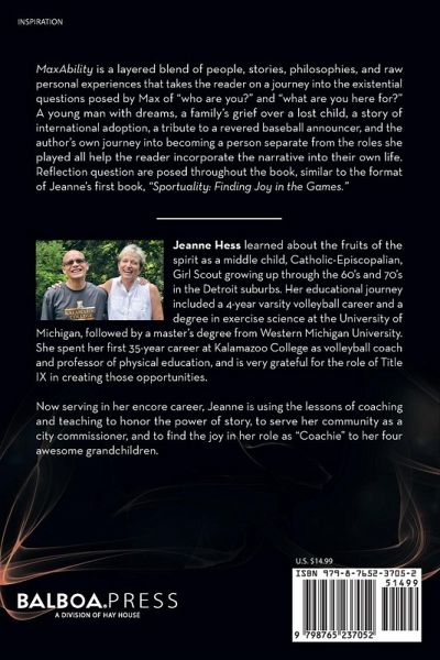MaxAbility is a layered blend of people, stories, philosophies, and raw personal experiences that takes the reader on a journey into the existential questions posed by Max of "who are you?" and "what are you here for?" A young man with dreams, a family's grief over a lost child, a story of international adoption, a tribute to a revered baseball announcer, and the author's own journey into becoming a person separate from the roles she played all help the reader incorporate the narrative into their own life. Reflection question are posed throughout the book, similar to the format of Jeanne's first book, "Sportuality: Finding Joy in the Games."