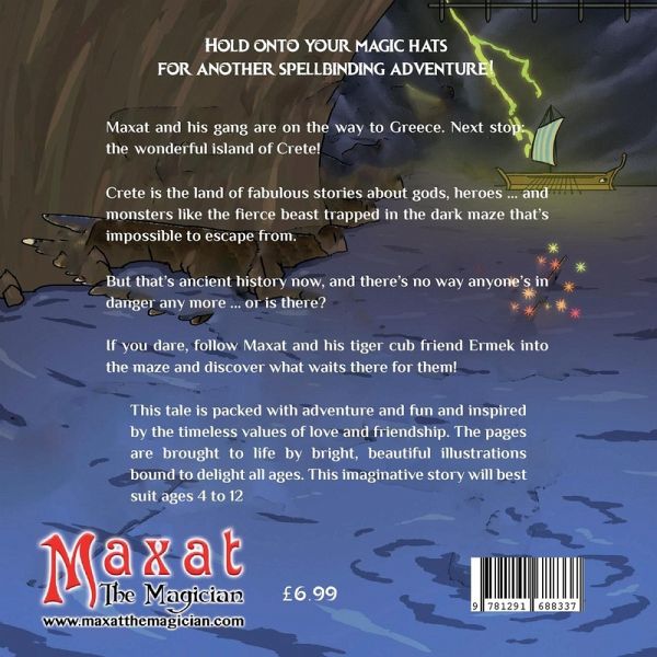 Hold onto your magic hats for another spellbinding adventure! Maxat and his gang are on the way to Greece. Next stop: the wonderful island of Crete! Crete is a land of fabulous stories about gods, heroes . . . and monsters, like the fierce beast trapped in a dark maze that's impossible to escape from. But that's ancient history now, and there's no way anyone's in danger anymore. . . or is there? If you dare, follow Maxat and his tiger cub friend Ermek into the maze and discover what waits there for them! Short Description This is the 12th book of Maxat the Magician series, inspired by Greek mythology. Visiting Crete holds many pleasures and discoveries. Excitement makes Maxat and Ermek wonder away from the rest of the family. The ever adventurous duo fall into a parallel dimension once again, but this time into a Deadly Maze! Will they be prisoners of it forever?
