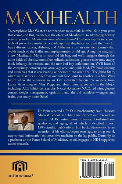 To paraphrase Mae West, it's not the years in your life, but the life in your years that count, and this, precisely, is the object of Maxihealth: to add happy, healthy years to your life. Maxihealth means optimal health! This book aspires to be your bible of preventive medicine; a roadmap, that shepherds you past the risks for heart disease, cancer, diabetes, and Alzheimer's on an extended journey that avoids much of the frailty and unpleasantness of old age. Along the way, stuff a few Maxihealth Mojos in your old kit bag, and we'll navigate through the mine fields of obesity, stress, free radicals, addictions, glucose tantrums, crappy food, lethargy, depression, and the new bad boy, inflammation. We'll learn of the conspiracy between your Stone Age genes and junk food, TV brainwashing and munchies that is accelerating our descent into what I call The Jabba State, where we'll slither all day from one fast food joint to another in a Star Wars future where the monsters are us. Get motivated by our role models, from Lance Armstrong to Miss Piggy, and then immerse yourself in the Mojos including: ACE inhibitors, exercise, N-acetylcysteine (NAC), red wine, glucose control, weight management, optimism, and the old standbys---veggies and fruits, plus many more. Salut!