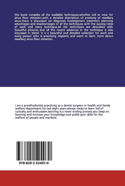 this book compiles all the available techniques,whether old or new for sinus floor elevation,with a detailed description of anatomy of maxillary sinus.there is discussion on diagnosis investigations treatment planning advantages and disadvantages of all the techniques with the success rates of each and every technique.all the techniques are described with beautiful pictures and all the recent advances in the technique is also discussed in detail. it is a beautiful and detailed collection for each and every person who is practicing implants and want to learn more about maxillary sinus floor elevation.