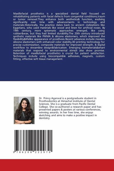 Maxillofacial prosthetics is a specialized dental field focused on rehabilitating patients with facial defects from congenital conditions,traum or tumor removal.They enhance both aesthetics& function, evolving significantly over time with advancements in technology and materials.Historically, the practice dates back to ancient civilizations like Egyptians, who used materials like wood and linen for artificial noses. By 19th century, more systematic approaches emerged, like using rubber&wax, but they had limited durability.The 20th century introduced synthetic materials like PMMA & silicone elastomers, which improved the flexibility&lifelike appearance of prosthesis.Recent advances include modern silicone elastomers with enhanced color stability,3D printing technology for precise customization, composite materials for improved strength, & digital workflow to streamline design&fabrication. Emerging biomaterials&smart materials that respond to environmental stimuli also show promise. Retention of maxillofacial prosthetics is crucial for patient satisfaction. Techniques include using biocompatible adhesives, magnets, custom fitting, effective soft tissue management.