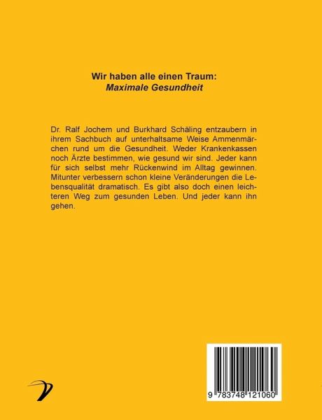 Dr. Ralf Jochem und Burkhard Schäling entzaubern in ihrem Ratgeber auf unterhaltsame Weise Ammenmärchen rund um die Gesundheit. Im Teil 1 klärt das Buch die Frage, was Gesundheit überhaupt ist. Allein die veraltete Vorstellung von Gesundheit als Abwesenheit von Krankheit hindert viele Menschen daran, das in ihnen schlummernde Potenzial zu maximaler Gesundheit zu nutzen. Teil 2 entlarvt einige der größten Krankmacher, vor allem bei der Ernährung. Der 3. Teil beschreibt die Hauptsäulen maximaler Gesundheit: positives Denken, gesunde Ernährung und maßvolle Bewegung. Im 4. Teil geht es um aktuelle Ernährungstrends und Superfoods.Die 60 Fotos und Illustrationen lockern den humorvollen Text zusätzlich auf. Dabei wiederholt das Buch nicht die radikalen, oft unzumutbaren Forderungen der »Gesundheits-Gurus«. Vielmehr möchte es den Leser ermuntern, an den richtigen Stellschrauben zu drehen, um mit minimalem Aufwand zu maximaler Gesundheit zu gelangen. Mitunter verbessern schon kleine Veränderungen die Lebensqualität dramatisch. So kann jeder mehr Rückenwind im Alltag gewinnen. Das Credo der Herausgeber: Es gibt einen leichteren Weg zum gesunden Leben. Und jeder kann ihn gehen.