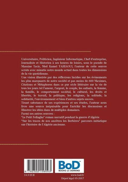 Universitaire, Politicien, Ingénieur Informatique, Chef d'entreprise, Journaliste et Historien à ses heures de loisirs, sous le pseudo de Massine Tacir, Med Kamel YAHIAOUI, l'auteur de cette oeuvre scrute avec minutie notre monde actuel dans toutes les dimensions de la vie quotidienne.Une vision illustrée par des réflexions lucides sur les évènements les plus marquants de notre société et pas moins de 600 Maximes, Citations et Métaphores dans ce pur style littéraire sur la vie de tous les jours tel l'amour, l'argent, le couple, les enfants, la femme, la famille, le comportement sociétal, le culturel, les droits et libertés, le travail, la politique, les religions, la solitude, la solidarité, l'environnement et bien d'autres sujets encore.Tirant substance de ses expériences et études, l'auteur nous livre une source inépuisable pour Enrichir les discussions et Illustrer les idées dans de multiples domaines.