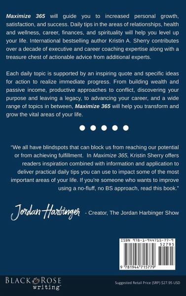 "365 is your playbook to shift your mindset and creatively solve problems to improve your life in the most important areas." -Beth Comstock, author, Imagine It Forward and Forbes' Top 100 Most Powerful Women Maximize 365 will guide you to increased personal growth, satisfaction, and success. Daily tips in the areas of relationships, health and wellness, career, finances, and spirituality will help you level up your life. International bestselling author Kristin A. Sherry contributes over a decade of executive and career coaching expertise along with a treasure chest of actionable advice from additional experts. Each daily topic is supported by an inspiring quote and specific ideas for action to realize immediate progress. From building wealth and passive income, productive approaches to conflict, discovering your purpose and leaving a legacy, to advancing your career, and a wide range of topics in between, Maximize 365 will help you transform and grow the vital areas of your life.