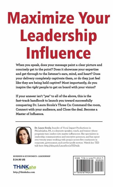 Let's face it: Leadership is more than a role, it's an image, and the way that you communicate -- to anyone and everyone -- will either reinforce your leadership image in their mind, or sabotage it. You've heard the expression, "It's not what you say, it's how you say it." The truth is: if you want to be a master of influence, it's both. When you speak, does your message paint a clear picture and concisely get to the point? Does it showcase your expertise and get through to the listener's ears, mind and heart? Does your delivery completely captivate them, or do they just feel like they are being held captive? Most importantly, does your delivery inspire people to get on board with your vision? If your answer isn't "yes" to all of the above, this is the fast-track handbook to launch you to successfully conquering Dr. Laura Sicola's Three Cs: Command the room, Connect with your audience and Close the deal, and becoming a Master of Influence. Maximize Your Leadership Influence is part of the THiNKaha series, whose slim and handy books contain 140 well-thought-out AHA messages. Increase your online influence by picking up AHAthat, and easily share quotes from this book on Twitter, Facebook, LinkedIn, and Google+ via this link: http://aha.pub/LeadershipInfluence