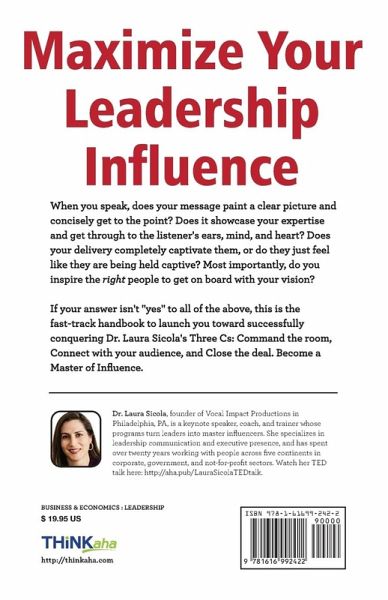 Let's face it: Leadership is more than a role, it's an image, and the way that you communicate -- to anyone and everyone -- will either reinforce your leadership image in their mind, or sabotage it. You've heard the expression, "It's not what you say, it's how you say it." The truth is: if you want to be a master of influence, it's both. When you speak, does your message paint a clear picture and concisely get to the point? Does it showcase your expertise and get through to the listener's ears, mind and heart? Does your delivery completely captivate them, or do they just feel like they are being held captive? Most importantly, does your delivery inspire people to get on board with your vision? If your answer isn't "yes" to all of the above, this is the fast-track handbook to launch you to successfully conquering Dr. Laura Sicola's Three Cs: Command the room, Connect with your audience and Close the deal, and becoming a Master of Influence. Maximize Your Leadership Influence is part of the THiNKaha series, whose slim and handy books contain 140 well-thought-out AHA messages. Increase your online influence by picking up AHAthat, and easily share quotes from this book on Twitter, Facebook, LinkedIn, and Google+ via this link: http://aha.pub/LeadershipInfluence