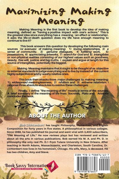 Making Meaning is the first book to develop the idea of making meaning, defined as "having positive impact with one's actions." This is the greatest idea since everything has a meaning (an effect or relationship). It asks the life-or-death question does my life have enough meaning to continue to live it? This book answers this question by developing the following main sources (or avenues) of making meaning: 1) loving relationships, 2) a sense of community, 3) genuine dialogues, 4) ful- filling work, 5) possessions, 6) appreciating artworks, 7) search for God and 8) intangibles or non- physical realities consisting of our highest values such as goodness, beauty, free will, justice and big truths. I explain and argue at length for this source of intangibles, potentially the biggest. Making Meaning maintains that it ought to be thought of as objective or external standards to judge everything and to live by instead of the current highly subjective or wishy-washy relative ones. This book then attacks three major challenges to making meaning: 1) widespread meaninglessness, 2) nihilism and 3) extreme relativism. I propose three absolute absolutes to resolve these challenges. Finally, I define "the meaning of life" mostly in terms of the sources. A brief summary of the meaning of life from Socrates, Plato and Aristotle concludes the book.