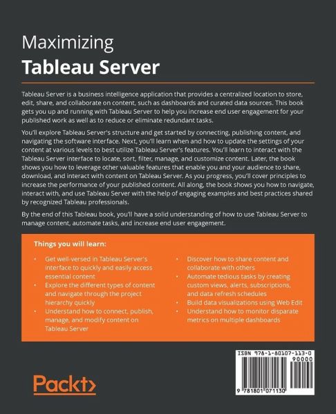 Enhance the way you use Tableau Server's analytical tools by learning how to manage content to drive user engagement Key Features:Understand how to quickly get connected, start publishing workbooks, and adjust basic settings Navigate the Tableau Server interface to filter and locate content, customize viewing options, and automate various tasks Learn best practices for improving the efficiency of workbooks and data sources Book Description: Tableau Server is a business intelligence application that provides a centralized location to store, edit, share, and collaborate on content, such as dashboards and curated data sources. This book gets you up and running with Tableau Server to help you increase end-user engagement for your published work as well as reduce or eliminate redundant tasks. You'll explore Tableau Server's structure and how to get started by connecting, publishing content, and navigating the software interface. Next, you'll learn when and how to update the settings of your content at various levels to best utilize Tableau Server's features. You'll understand how to interact with the Tableau Server interface to locate, sort, filter, manage and customize content. Later, the book shows you how to leverage other valuable features that enable you and your audience to share, download, and interact with content on Tableau Server. As you progress, you'll cover principles to increase the performance of your published content. All along, the book shows you how to navigate, interact with, and use Tableau Server with the help of engaging examples and best practices shared by recognized Tableau professionals. By the end of this Tableau book, you'll have a solid understanding of how to use Tableau Server to manage content, automate tasks, and increase end-user engagement. What You Will Learn:Get well-versed in Tableau Server's interface to quickly and easily access essential content Explore the different types of content and navigate through the project hierarchy quickly Understand how to connect, publish, manage, and modify content on Tableau Server Discover how to share content and collaborate with others Automate tedious tasks by creating custom views, alerts, subscriptions, and data refresh schedules Build data visualizations using Web Edit Understand how to monitor disparate metrics on multiple dashboards Who this book is for: This Tableau software book is for BI developers, data analysts, and everyday users who have access to Tableau Server and possess basic web navigation skills. No prior experience with Tableau Server is required.