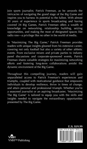Sports journalist, Patrick Freeman, unravels the intricacies of navigating the grand stage of the Big Game and inspires you to harness its potential to the fullest. With almost 30 years of experience in sports broadcasting and having covered 24 Big Games, Freeman offers a wealth of knowledge on networking, relationship building, seizing opportunities, and making the most of designated spaces like radio row-a privilege like no other in the world of media. In Maximizing The Big Game, Freeman provides readers with unique insights gleaned from his extensive career, covering not only the NFL but also a variety of other athletic events. From exclusive mixers and private parties to industry panel discussions and corporate-sponsored events, Freeman shares valuable strategies for maximizing networking efforts and fostering long-term collaborations amidst the dynamic environment of the Super Bowl. Throughout this compelling journey, readers will gain unparalleled access to Freeman's experiences and triumphs, coupled with motivational guidance that empowers individuals to develop resilience, thrive in times of change, and attain personal and professional triumph. Whether you're a seasoned journalist or an aspiring broadcaster, "Maximizing The Big Game" is tailored to equip you with the skills and insights needed to navigate the extraordinary opportunities presented by the Big Game.