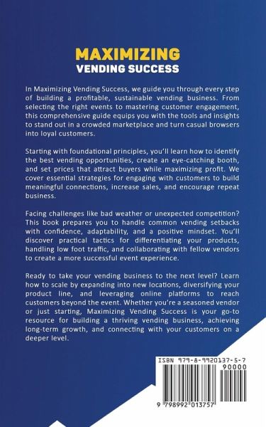 In Maximizing Vending Success, we guide you through every step of building a profitable, sustainable vending business. From selecting the right events to mastering customer engagement, this comprehensive guide equips you with the tools and insights to stand out in a crowded marketplace and turn casual browsers into loyal customers. Starting with foundational principles, you'll learn how to identify the best vending opportunities, create an eye-catching booth, and set prices that attract buyers while maximizing profit. We cover essential strategies for engaging with customers to build meaningful connections, increase sales, and encourage repeat business. Facing challenges like bad weather or unexpected competition? This book prepares you to handle common vending setbacks with confidence, adaptability, and a positive mindset. You'll discover practical tactics for differentiating your products, handling low foot traffic, and collaborating with fellow vendors to create a more successful event experience. Ready to take your vending business to the next level? Learn how to scale by expanding into new locations, diversifying your product line, and leveraging online platforms to reach customers beyond the event. Whether you're a seasoned vendor or just starting, Maximizing Vending Success is your go-to resource for building a thriving vending business, achieving long-term growth, and connecting with your customers on a deeper level. Get Your Copy by Clicking on the "Buy Now" Button Right Now!
