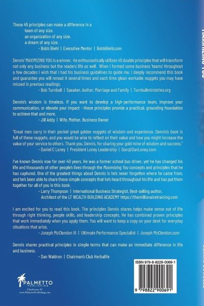 Have you ever felt that your life has been out of balance and ineffective? Overwhelmed by choices, most of us struggle to move forward productively to achieve what we want from life without compromising our values. But maybe success isn't as complicated as we think. Learn how to get over your past and then move forward as you develop the buried potential that will make your life more balanced and effective, as well as create a legacy of significance. Learn how to respond to contentious, critical people to make them respect you. Communicate more effectively and leave a great impression with every conversation, stranger, and friend. Recognize your value and how meaningful you are to those around you. In Maximizing You, author Dennis Dowdell provides a list of "45 Principles for Success," guiding concepts that are at once simple, profound, and extraordinarily helpful. Available in Spanish