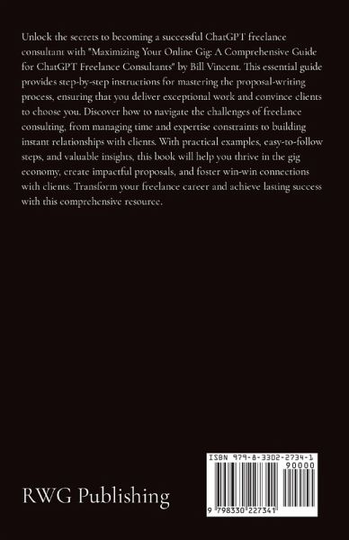 Unlock the secrets to becoming a successful ChatGPT freelance consultant with "Maximizing Your Online Gig: A Comprehensive Guide for ChatGPT Freelance Consultants" by Bill Vincent. This essential guide provides step-by-step instructions for mastering the proposal-writing process, ensuring that you deliver exceptional work and convince clients to choose you. Discover how to navigate the challenges of freelance consulting, from managing time and expertise constraints to building instant relationships with clients. With practical examples, easy-to-follow steps, and valuable insights, this book will help you thrive in the gig economy, create impactful proposals, and foster win-win connections with clients. Transform your freelance career and achieve lasting success with this comprehensive resource.