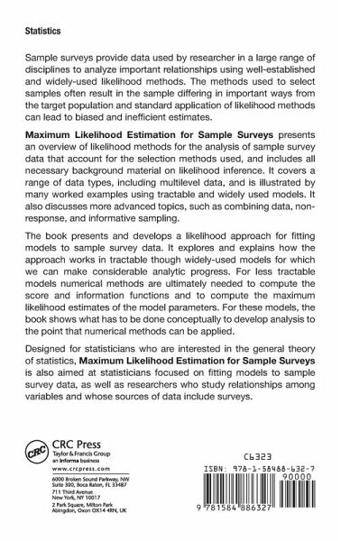 Sample surveys provide data used by researchers in a large range of disciplines to analyze important relationships using well-established and widely used likelihood methods. The methods used to select samples often result in the sample differing in important ways from the target population and standard application of likelihood methods can lead to biased and inefficient estimates. Maximum Likelihood Estimation for Sample Surveys presents an overview of likelihood methods for the analysis of sample survey data that account for the selection methods used, and includes all necessary background material on likelihood inference. It covers a range of data types, including multilevel data, and is illustrated by many worked examples using tractable and widely used models. It also discusses more advanced topics, such as combining data, non-response, and informative sampling. The book presents and develops a likelihood approach for fitting models to sample survey data. It explores and explains how the approach works in tractable though widely used models for which we can make considerable analytic progress. For less tractable models numerical methods are ultimately needed to compute the score and information functions and to compute the maximum likelihood estimates of the model parameters. For these models, the book shows what has to be done conceptually to develop analyses to the point that numerical methods can be applied. Designed for statisticians who are interested in the general theory of statistics, Maximum Likelihood Estimation for Sample Surveys is also aimed at statisticians focused on fitting models to sample survey data, as well as researchers who study relationships among variables and whose sources of data include surveys.