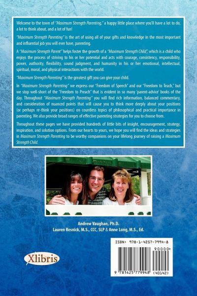 Welcome to the town of "Maximum Strength Parenting," a happy little place where you'll have a lot to do, a lot to think about, and a lot of fun! "Maximum Strength Parenting" is the art of using all of your gifts and knowledge in the most important and influential job you will ever have, parenting. A "Maximum Strength Parent" helps foster the growth of a "Maximum Strength Child", which is a child who enjoys the process of striving to his or her potential and acts with courage, consistency, responsibility, power, authority, flexibility, sound judgment, and humanity in his or her emotional, intellectual, spiritual, moral, and physical interactions with the world. "Maximum Strength Parenting" is the greatest gift you can give your child. In "Maximum Strength Parenting" we express our "Freedom of Speech" and our "Freedom to Teach," but we stop well-short of the "Freedom to Preach" that is evident in so many 'parent-advice' books of the day. Throughout "Maximum Strength Parenting" you will find rich information, balanced commentary, and consideration of nuanced points that will cause you to think more deeply about your positions (or perhaps re-think your positions) on countless topics of philosophical and practical importance in parenting. We also provide broad ranges of effective parenting strategies for you to choose from. Throughout these pages we have provided hundreds of little bits of insight, encouragement, strategy, inspiration, and solution options. From our hearts to yours, we hope you will find the ideas and strategies in Maximum Strength Parenting to be worthy companions on your lifelong journey of raising a Maximum Strength Child. Andrew Vaughan, Ph.D. Lauren Resnick, M.S., CCC, SLP, & Anne Long, M.S., Ed.