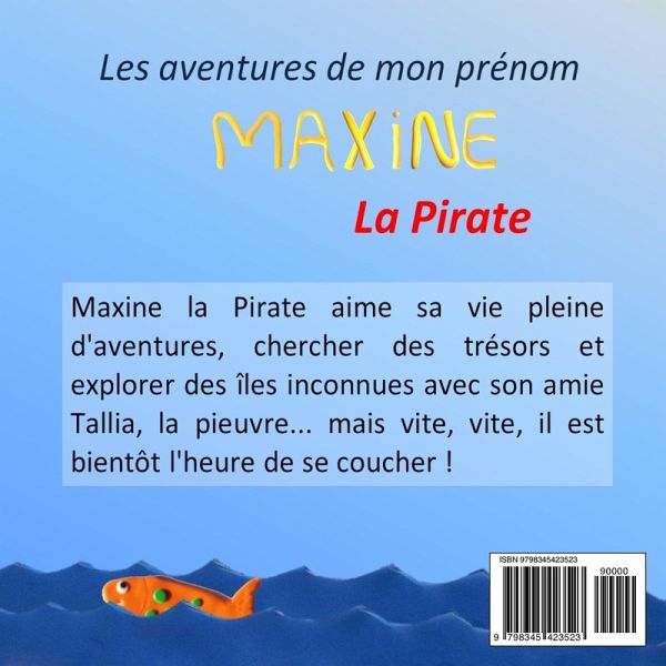 Maxine la Pirate aime sa vie pleine d'aventures, chercher des trésors et explorer des îles inconnues avec son amie Tallia, la pieuvre... mais vite, vite, il est bientôt l'heure de se coucher ! Offrez le bonheur de lire à votre enfant avec Les Aventures de mon prénom, des livres personnalisés à son prénom, illustrés en pâte à modeler, à lire avant de dormir. Vous voulez un autre prénom que Maxine ? Sur notre site internet, choisissez parmi les 14 thèmes des Aventures de mon prénom (pirate, astronaute, cowboy, ballerine...) et personnalisez le livre au prénom de votre enfant. En quelques jours, votre livre sera disponible à la commande sur Amazon !