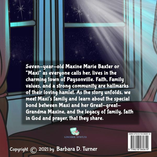 Seven-year-old Maxine Marie Baxter or "Maxi" as everyone calls her, lives in the charming town of Paysonville. Faith, Family values, and a strong community are the hallmarks of their loving hamlet. As the story unfolds, we meet Maxi's family and learn about the special bond between Maxi and her Great-great- Grandma Maxine, and the legacy of family, faith in God, and prayer that they share.