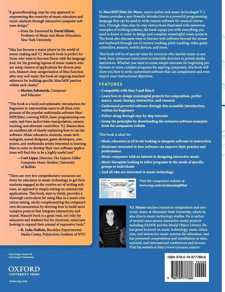 A practical guide for readers of all levels of programming ability, Max/MSP/Jitter for Music teaches all of the necessary skills for writing custom software for musical interaction using the programming language Max/MSP/Jitter. In step-by-step instructions, expert author VJ Manzo guides readers through all of the essential concepts and steps for designing and completing projects. Manzo's applications are remarkably broad; from complex programs which explore relationships between modes for veteran composers to basic exercise for beginners that helps improve finger dexterity, the range of possibilities this book opens up will impress both new and experienced users of music technologies. With clear, hands-on examples, Manzo teaches readers to write effective, customized software which supplements and complement their instructional and musical objectives. The book also discusses ways to interact with the software beyond the mouse and keyboard through use of camera tracking, pitch tracking, video game controllers, sensors, mobile devices, and more. Chapter review sections remind readers of key commands and important concepts, buildling a solid foundation in understanding Max and its structure, while connecting it to music making and learning concepts. Extensively illustrated throughout and packed with practical tips, this book will be invaluable for musicians and teachers looking to supplement their lessons with interactive instructional tools, develop adaptive instruments to aid in composition and performance activities, and create measurement tools with which to conduct research.