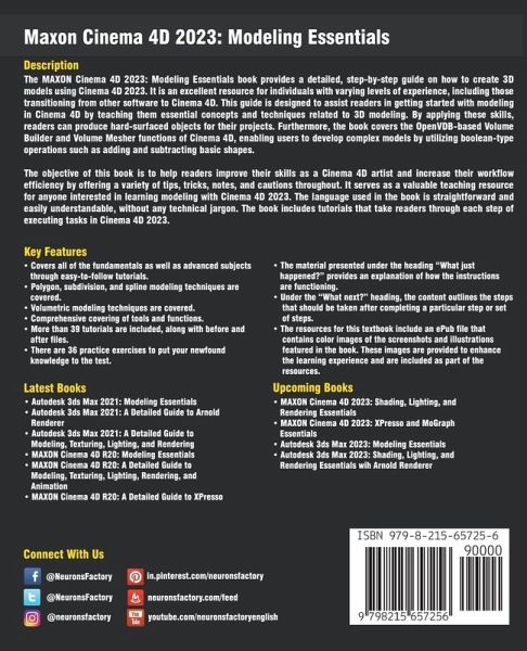 The MAXON Cinema 4D 2023: Modeling Essentials book provides a detailed, step-by-step guide on how to create 3D models using Cinema 4D 2023. It is an excellent resource for individuals with varying levels of experience, including those transitioning from other software to Cinema 4D. This guide is designed to assist readers in getting started with modeling in Cinema 4D by teaching them essential concepts and techniques related to 3D modeling. By applying these skills, readers can produce hard-surfaced objects for their projects. Furthermore, the book covers the OpenVDB-based Volume Builder and Volume Mesher functions of Cinema 4D, which enable users to develop complex models by utilizing boolean-type operations such as adding and subtracting basic shapes. The objective of this book is to help readers improve their skills as Cinema 4D artists and increase their workflow efficiency by offering a variety of tips, tricks, notes, and cautions throughout. It serves as a valuable teaching resource for anyone interested in learning modeling with Cinema 4D 2023. The language used in the book is straightforward and easily understandable, without any technical jargon. The book includes tutorials that take readers through each step of executing tasks in Cinema 4D 2023. Contents Chapter 1 - Introduction to Cinema 4D 2023 Chapter 2 - Tools Chapter 3 - Spline Modeling Chapter 4 - Polygon Modeling-I Chapter 5 - Polygon Modeling-II Chapter 6 - Edge Flow and Topology Chapter 7 - Volumes Key FeaturesLearn about the user interface, navigation, tools, functions, and commands in Cinema 4D. Covers all of the fundamentals as well as advanced subjects through easy-to-follow tutorials. Polygon, subdivision, and spline modeling techniques are covered. Volumetric modeling techniques are covered. Comprehensive covering of tools and functions. More than 39 tutorials are included, along with before and after files. There are 36 practice exercises to put your newfound knowledge to the test. Additional guidance is provided in the form of tips, notes, and cautions. Important terms are in bold face so that you never miss them. The material presented under the heading "What just happened?" provides an explanation of how the instructions are functioning. Under the "What next?" heading, the content outlines the steps that should be taken after completing a particular step or set of steps. The resources for this textbook include an ePub file that contains color images of the screenshots and illustrations featured in the book. These images are provided to enhance the learning experience and are included as part of the resources. Access to the starting and ending states of each tutorial, as well as the resources used in the tutorials, is available to you. For more information visit, Neurons Factory website.