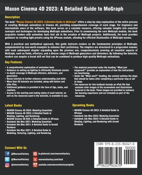 The book "Maxon Cinema 4D 2023: A Detailed Guide to MoGraph" offers a step-by-step explanation of the entire process of creating MoGraph animations in Cinema 4D, providing comprehensive coverage of each stage. For beginners and intermediate users of the software, this book serves as a valuable resource, offering valuable insights into essential concepts and techniques for developing MoGraph animations. Prior to commencing the core MoGraph module, the book acquaints readers with animation tools that aid in the creation of MoGraph projects. Additionally, the book provides guidance on creating light presets using the XPresso module, allowing for efficient illumination of MoGraph scenes. With a practical and methodical approach, this guide instructs readers on the fundamental principles of MoGraph, complemented by real-world examples to enhance their proficiency. The chapters are structured in a progressive manner, with each subsequent chapter expanding upon the previous one, comprehensively covering all essential aspects of MoGraph, such as fields, effectors, and a diverse range of MoGraph generators and deformers. By following the tutorials, readers can acquire a broad skill set that can be combined to produce high-quality MoGraph animations. Table of Content:Chapter 1 - Understanding Keyframes and Animation Chapter 2 - Introduction to MoGraph Chapter 3 - Effectors Chapter 4 - Fields Chapter 5 - Other MoGraph Objects Chapter 6 - Bonus Tutorials