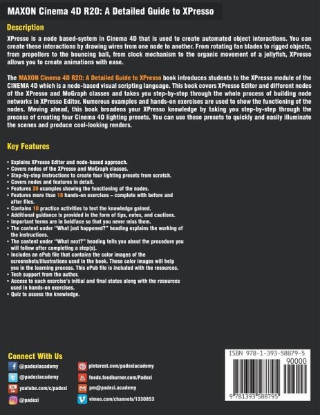 XPresso is a node-based system in Cinema 4D that is used to create automated object interactions. You can create these interactions by drawing wires from one node to another. From rotating fan blades to rigged objects, from propellers to the bouncing ball, from clock mechanism to the organic movement of a jellyfish, XPresso allows you to create animations with ease. The MAXON Cinema 4D R20: A Detailed Guide to XPresso book introduces students to the XPresso module of the Cinema 4D which is a node-based visual scripting language. This book covers XPresso Editor and different nodes of the XPresso and MoGraph classes and takes you step-by-step through the whole process of building node networks in XPresso Editor. Numerous examples and hands-on exercises are used to show the functioning of the nodes. Moving ahead, this book broadens your XPresso knowledge by taking you step-by-step through the process of creating four Cinema 4D lighting presets. You can use these presets to quickly and easily illuminate the scenes and produce cool-looking renders. Practicing is one of the best ways to improve skills. This book contains practice activities which you are highly encouraged to complete and gain confidence for real-world projects. By completing these activities, you will be able to master the powerful capabilities of Cinema 4D. By the time you're done, you'll be ready to create hard-surface models in Cinema 4D. If you buy this book, you'll also get access to all preset files, Cinema 4D files, texture files, and any other resource used in the book. You are free to use these resources in your own projects personal or commercial. These working files allow you to follow along with the author throughout the lessons. This book shares tips, tricks, notes, and cautions throughout, that will help you become a better 3D artist and you will be able to speed up your workflow. This book is aimed to be a solid teaching resource for learning the XPresso module with Cinema 4D R20. It avoids any jargon and explains concepts and techniques in an easy-to-understand manner. The first page of every unit summarizes the topics that will be covered in the unit. Hands-on exercises in this book instruct users how things can be done in XPresso step-by-step. As students move from one exercise to another, they will be gaining robust knowledge about the XPresso module of Cinema 4D. Key Features ¿ Explains XPresso Editor and node-based approach. ¿ Covers nodes of the XPresso and MoGraph classes. ¿ Step-by-step instructions to create four lighting presets from scratch. ¿ Covers nodes and features in detail. ¿ Features 30 examples showing the functioning of the nodes. ¿ Features more than 18 hands-on exercises – complete with before and after files. ¿ Contains 10 practice activities to test the knowledge gained. ¿ Additional guidance is provided in the form of tips, notes, and cautions. ¿ Important terms are in boldface so that you never miss them. ¿ The content under "What just happened?" heading explains the working of the instructions. ¿ The content under "What next?" heading tells you about the procedure you will follow after completing a step(s). ¿ Tech support from the author. ¿ Access to each exercise's initial and final states along with the resources used in hands-on exercises. ¿ Quiz to assess knowledge. For more information, visit Padexi Academy's website.