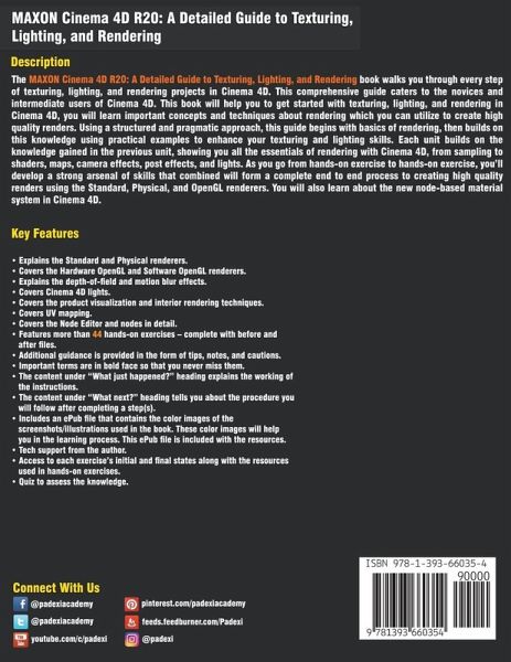 The MAXON Cinema 4D R20: A Detailed Guide to Texturing, Lighting, and Rendering book walks you through every step of texturing, lighting, and rendering projects in Cinema 4D. This comprehensive guide caters to the novices and intermediate users of Cinema 4D. This book will help you to get started with texturing, lighting, and rendering in Cinema 4D, you will learn important concepts and techniques about rendering which you can utilize to create high quality renders. Using a structured and pragmatic approach, this guide begins with basics of rendering, then builds on this knowledge using practical examples to enhance your texturing and lighting skills. Each unit builds on the knowledge gained in the previous unit, showing you all the essentials of rendering with Cinema 4D, from sampling to shaders, maps, camera effects, post effects, and lights. As you go from hands-on exercise to hands-on exercise, you'll develop a strong arsenal of skills that combined will form a complete end to end process to creating high quality renders using the Standard, Physical, and OpenGL renderers. You will also learn about the new node-based material system in Cinema 4D. For more info, visit Padexi Academy's website.