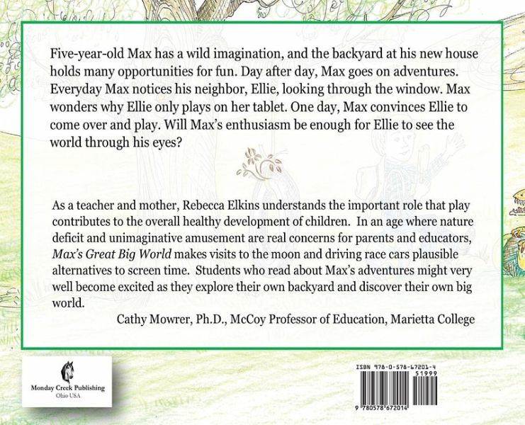 Rebecca Elkins, her husband Jeff, and their two children, Adilyne and Jeffrey, call Ohio home. Rebecca enjoys spending time with her family, reading on her porch swing, and baking. As a teacher, Rebecca has read thousands of children's books. It has always been a dream of hers to write her own story. Max's Great Big World is her first, but definitely not her last. Rebecca hopes this story inspires readers to put down their electronics and open up their imaginations.