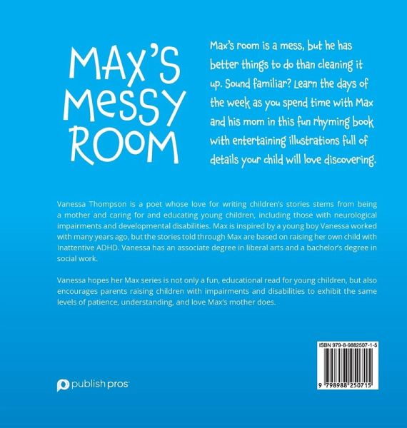 Max's room is a mess, but he has better things to do than cleaning it up. Sound familiar? Spend a week with Max and his mom through this fun rhyming book with entertaining illustrations full of details your child will love discovering. A great gift for kids ages 3 to 8, this illustrated children's book is enjoyable for both children and adults. Helps teach kids the days of the week and new words. Discussion questions included.