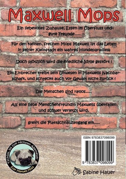 Ein liebevolles Zuhause, Essen im Überfluss und gute Freunde.....Für den kleinen, frechen Mops Maxwell ist das Leben in seiner Kleinstadt ein wahres Hundeparadies.Doch plötzlich wird die friedliche Idylle gestört !Ein Einbrecher treibt sein Unwesen in Maxwells Nachbarschaft, und schreckt auch vor Gewalt nicht zurück ! Die Menschen sind ratlos.....Als eine liebe Menschenfreundin Maxwells überfallen und schwer verletzt wird, greifen Maxwell Mops, seine Katzen-Schwester Daisy, sein Boxer-Freund Cash und die Bulldogge Oskar ein.....