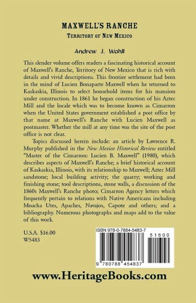 This slender volume offers readers a fascinating historical account of Maxwell's Ranche, Territory of New Mexico that is rich with details and vivid descriptions. This frontier settlement had been in the mind of Lucien Bonaparte Maxwell when he returned to Kaskaskia, Illinois to select household items for his mansion under construction. In 1861 he began construction of his Aztec Mill and the locale which was to become known as Cimarron when the United States government established a post office by that name at Maxwell's Ranche with Lucien Maxwell as postmaster. Whether the mill at any time was the site of the post office is not clear. Topics discussed herein include: an article by Lawrence R. Murphy published in the New Mexico Historical Review entitled "Master of the Cimarron: Lucien B. Maxwell" (1980), which describes aspects of Maxwell's Ranche; a brief historical account of Kaskaskia, Illinois, with its relationship to Maxwell; Aztec Mill sandstone; local building activity; the quarry; working and finishing stone; tool descriptions, stone walls, a discussion of the 1860s Maxwell's Ranche photo; Cimarron Agency letters which frequently pertain to relations with Native Americans including Moacha Utes, Apaches, Navajos, Capote and others; and a bibliography. Numerous photographs and maps add to the value of this work.