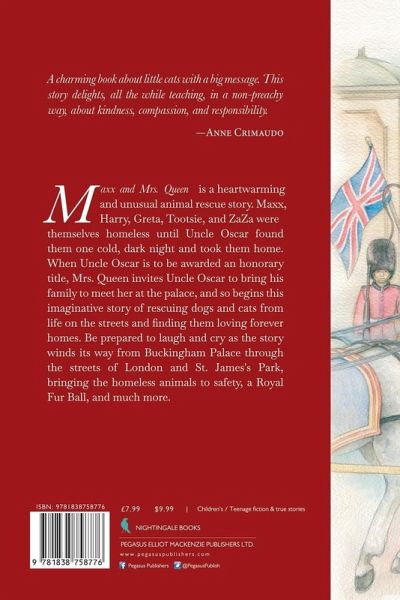 Maxx and Mrs. Queen is a heartwarming and unusual animal rescue story. Maxx, Harry, Greta, Tootsie, and ZaZa were themselves homeless until Uncle Oscar found them one cold, dark night and took them home. When Uncle Oscar is to be awarded an honorary title, Mrs. Queen invites Uncle Oscar to bring his family to meet her at the palace, and so begins this imaginative story of rescuing dogs and cats from life on the streets and finding them loving forever homes. Be prepared to laugh and cry as the story winds its way from Buckingham Palace through the streets of London and St. James's Park, bringing the homeless animals to safety, a Royal Fur Ball, and much more.