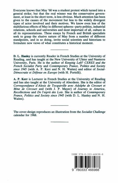 Elusive May - the paradox of a moment in history, David Hanley and Anne P.Kerr; 68 - the rise and fall of a generation, Herve Hamon; ecoles, colleges and lycees in France since 1968, Antoine Prost; student protest - 1968 and 1986 compared, Roger Duclaud-Williams; the aftermath of May 68 for Gaullism, the right and the centre, Jean Charlot; May 68 - parenthesis or staging post in the development of the socialist left?, Laurence Bell; the events of May - consequences for industrial relations in France, Jeff Bridgford; trade union strategies after May 68, Rene Mouriaux; trade unions and women workers after 1968, Margaret Gibbon; not looking back at 68 - contemporary French women film makers, Ginette Vincendeau; the representation of Vietnam in French films before and after 1968, Celia Britton; the concept of generation as exemplified by the class of 68, Pascal Ory; souvenirs, souvenirs, Marie-Noelle Thibault; stepping stone and shifting legacy - a few conclusions and reappraisals of May 1968 and its history, Vladimir-Claude Fisera.