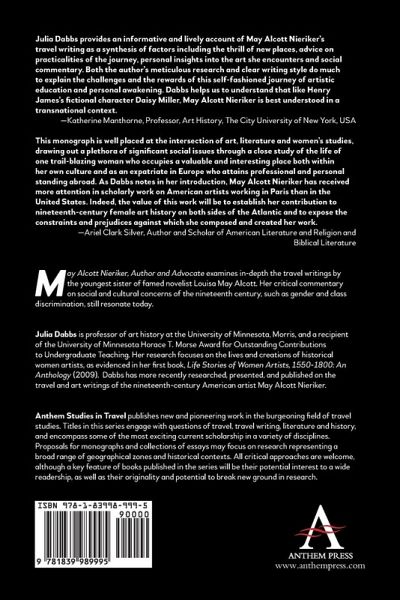 May Alcott Nieriker, Author and Advocate examines in-depth the travel writings by the youngest sister of famed novelist Louisa May Alcott. Her critical commentary on social and cultural concerns of the nineteenth century, such as gender and class discrimination, still resonate today.