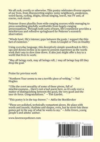 We all rock, overtly or otherwise. This poetry celebrates diverse aspects of our lives, from disconcerting angles: noisy neighbours, awakeness, weird fauna, cycling, thighs, travel, throat-singing, 70s TV and, of course, rock music. Life's transience provides a laugh-out-loud and mischievous springboard for Pettener's eccentric observations: "Winds howl, life's intense; gaps between the gusts / support the thin fact of existence." Using everyday language, this poetry is profoundly accessible. Pettener's deceptively simple soundtrack to life's ups and downs, while clearly meditative, may just provide a key to a world that lives to work, instead of vice-versa: "May all beings rock, may all beings roll; / may all beings bop till they drop the goal." Rolling through the huge space between the established performance scene and traditional UK poetry publishing, this collection rocks!