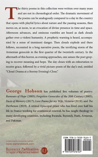 The thirty poems in this collection were written over many years and are not in chronological order. The dramatic movement of the poems can be analogously compared to a day in the country that opens with playful lyrics about nature and the passing seasons, then moves on, at noon, to an evocation of divine presence in time and space. Afternoon advances, and ominous rumbles are heard as dark clouds gather over a violent humanity. A prophetic warning is heard, accompanied by a sense of imminent danger. Then clouds explode and there follows, recounted in a long narrative poem, the terrifying storm of the Armenian genocide in the first quarter of the twentieth century. In the aftermath of this horror, as evening approaches, one senses the poet groping to recover meaning and hope. The day closes with an exhortation to receive grace, followed by a vivid picture-poem of the day's end, entitled ""Cloud-Drama at a Stormy Evening's Close.""
