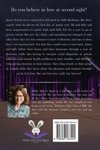 Do you believe in love at second sight? James Newell never expected to fall hard for Sally Bachman. But that's exactly what he did on the first day of junior year. He and Sally had been acquaintances in junior high until Sally left for a year to go to private school. But now she's back, and something has changed. It only takes three days for this romance to start to blossom, and once it does, there's no turning back. Not that they would want to turn back. James and Sally follow their hearts and their hormones through a year of discovery while also having to navigate social disparities at school, addiction and mental health problems in their families, and difficulty with paying attention in class. They cling closely to their group of friends while they learn about the pleasures and surprises brought on by first love. But can first love really last forever? May I Have Your Attention Please is the first book in the series, McKinney High Class of 1986. This series tells the stories of seven high school friends, Sally, Kim, Michelle, Darlene, James, Carl, and Chris, highlighting their successes and struggles from early childhood into adulthood. Along the way, they learn the true meaning of loyalty, and that your first friends are often the most special. This is an ongoing story about coming of age and falling in love in the wicked awesome, and sometimes confusing and funny, world of the1980s.