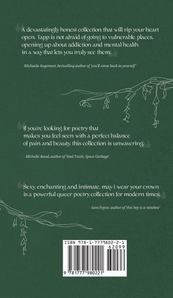 Enjoy the newly revised hardcover edition of may i wear your crown by Christopher Tapp, featuring an exclusive prologue. Charting at #1 in gay poetry and #2 in Canadian poetry within its first week of release, may i wear your crown explores many themes including love & heartache, substance abuse, sobriety, self-discovery, and queer issues all while reminding us that magic is around in everything we do.The author takes us on their journey of falling in love, hitting rock bottom, and getting sober. This collection takes you on a journey within four sections: may i introduce myself, may i be your prince, may i strike a match, and may i take a breath. *It also includes 14 beautiful illustrations (some adult content) to go along with certain poems* Praise for the collection: "May I Wear Your Crown is a devastatingly honest collection that will rip your heart open. Tapp is not afraid of going to vulnerable places, opening up about addiction and mental health in a way that lets you truly see them. Anyone who's gone through transformation in life can relate to and find solace in these deeply personal poems." - Michaela Angemeer, bestselling author of 'you'll come back to yourself' "Confident in its queerness, proud of its vulnerability, May I Wear Your Crown is a passionate exhale of emotions, a bold exploration of queer identity and mental health experiences that left me feeling liberated, 'seen', and above all, ready to begin working on my very own fairytale." - Sam Payne, author of 'this boy is a rainbow' "A raw, poignant examination of love, sexuality, addiction, and mental health-all with a shining undercurrent of hope. If you're looking for poetry that makes you feel seen with a perfect balance of pain and beauty, this collection is unwavering." -Michelle Awad, author of 'Soul Trash, Space Garbage'