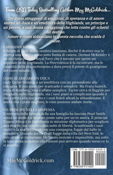 May McGoldrick Colección Regency Novella Dall'autrice May McGoldrick, bestseller di USA Today... Tre storie struggenti di emozioni, speranza e amore eterno: un duca e un'ereditiera delle Highlands, un principe e un povero, e una donna coraggiosa che lotta contro gli scherzi del destino. L'amore e le risate abbondano in questa raccolta di storie Regency che scaldano il cuore, scritta da un'amata autrice di romanzi storici. Carissima Millie Il futuro di Lady Millie sembra luminoso finché il destino non le riserva una tragica mano sotto forma di cancro. Dermot McKendry è un ex chirurgo della Royal Navy che è tornato per aprire un ospedale nelle Highlands. La Provvidenza li fa incontrare, ma le calamità della vita metteranno a dura prova il potere di guarigione del cuore umano. Come Scaricare un Duca Lady Taylor Fleming è un'ereditiera con un pretendente alle calcagna. Il suo piano per scaricarlo è semplice. Ma Franz Aurech, duca di Bamberg, non è affatto semplice. Taylor cerca di fuggire per rifugiarsi nelle Highlands, ma i suoi piani si complicano quando il duca arriva alla sua porta e i suoi fedeli alleati la abbandonano. E anche con i piani migliori, le cose possono andare storte... Un Principe Nella Dispensa Un rovescio della fortuna della sua famiglia ha lasciato Pearl Smith senza un soldo e a lavorare come sarta per un ex amico. Il principe Timour Mirza è in Inghilterra in missione diplomatica per scegliere una moglie, ma desidera una notte di libertà. Scambiando i suoi vestiti e la sua posizione con una compagna, fugge dal ballo in maschera. Quando anche Pearl fugge dalla villa del West End, le loro strade si incrociano. Un futuro insieme è impossibile, ma sotto la luna piena scoprono che l'amore può arrivare quando meno ce lo si aspetta.