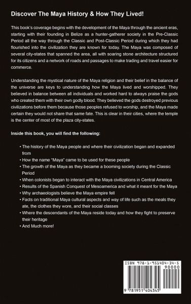 Discover The Maya History & How They Lived! This book’s coverage begins with the development of the Maya through the ancient eras, starting with their founding in Belize as a hunter-gatherer society in the Pre-Classic Period all the way through the Classic and Post-Classic Period during which they had flourished into the civilization they are known for today. The Maya was composed of several city-states that spanned the area, all with soaring stone architecture structured for its citizens and a network of roads and passages to make trading and travel easier for commerce. Understanding the mystical nature of the Maya religion and their belief in the balance of the universe are keys to understanding how the Maya lived and worshipped. They believed in balance between all individuals and worked hard to always praise the gods who created them with their own godly blood. They believed the gods destroyed previous civilizations before them because those peoples refused to worship, and the Maya made certain they would not share that same fate. This is clear in their cities, where the temple is the center of most of the plaza city-states. Maya architecture is left standing to this day, even after centuries of weathering and excavation from archaeologists. Their limestone structures were created carefully and mapped out using their mathematical skills, and they even used cement to hold stones together while also planning out the expansion of their temples to hold tombs. Inside this book, you will find the following: * The history of the Maya people and where their civilization began and expanded from * How the name "Maya" came to be used for these people * The growth of the Maya as they became a booming society during the Classic Period * When colonists began to interact with the Maya civilizations in Central America * Results of the Spanish Conquest of Mesoamerica and what it meant for the Maya * Why archaeologists believe the Maya empire fell * Details on the Maya religious tradition of human sacrifice and what that entailed * Other ways Maya sacrificed members of their society to the gods in religious gestures * Facts on traditional Maya cultural aspects and way of life such as the meals they ate, the clothes they wore, and their social classes * Where the descendants of the Maya reside today and how they fight to preserve their heritage * And more! Don’t wait another moment to enjoy from this information – Get your copy of Maya Civilization right away!