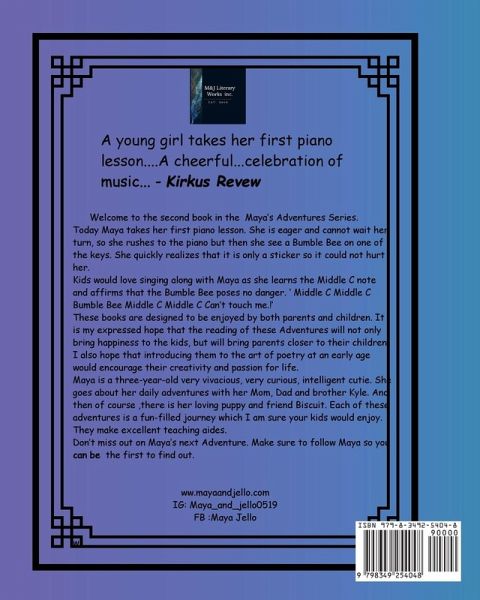 Welcome to the second book in the Maya's Adventures Series. Today Maya takes her first piano lesson. She is eager and cannot wait her turn, so she rushes to the piano but then she see a Bumble Bee on one of the keys. She quickly realizes that it is only a sticker so it could not hurt her. Kids would love singing along with Maya as she learns the Middle C note and affirms that the Bumble Bee poses no danger. ' Middle C Middle C Bumble Bee Middle C Middle C Can't touch me.!' These books are designed to be enjoyed by both parents and children. It is my expressed hope that the reading of these Adventures will not only bring happiness to the kids, but will bring parents closer to their children. I also hope that introducing them to the art of poetry at an early age would encourage their creativity and passion for life. Maya is a three-year-old very vivacious, very curious, intelligent cutie. She goes about her daily adventures with her Mom, Dad and brother Kyle. And then of course ,there is her loving puppy and friend Biscuit. Each of these adventures is a fun-filled journey which I am sure your kids would enjoy. They make excellent teaching aides. Don't miss out on Maya's next Adventure. Make sure to follow Maya so you can be the first to find out.