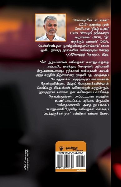 A collection of poems by Perumal Murugan, which includes poems from all his poetry collections except the recent one. Its the record of a poet's journey through two decades. There are interesting differences between earlier poems and recent ones. As the early poems are registering everyday experience in a poetic language, the later ones attempt to generalize them. In this generalization the poetry expands its charm and voice. Poet Isai says he is charmed by the later poems more. A reader is taken through this journey, witnessing the poets experience and ends up feeling them as their own.