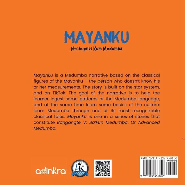 Mayanku is a Medumba narrative based on the classical figures of the Mayanku - the person who doesn't know his or her measurements. The story is built on the star system, and on TikTok. The goal of the narrative is to help the learner ingest some patterns of the Medumba language, and at the same time learn some basics of the culture: learn Medumba through one of its most recognizable classical tales. Mayanku is one in a series of stories that constitute Bangangte V: Ba'Fun Medumba. Or Advanced Medumba. Mayanku uses a fully immersive teaching method. Like all the book of the Bangangte series, it is a tool for the contemporary Medumba learner who is attuned to the social media, to the connectivity of the internet, and at the same time yearns for the intimate relation that a mother tongue or that a language makes possible. These books are trendy. They are culturally rooted, and are composed for young people, young adults and adults who would like to learn to speak, read, write and understand Medumba. They are mostly also available as exercise and audiobooks. They sometimes have teaching materials attached to them. Enjoy Mayanku!