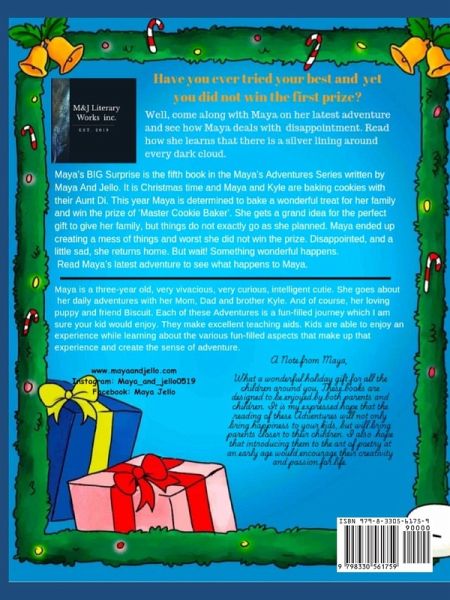 Welcome to the fifth book in the Maya's Adventures Series, written by Maya And Jello. This book is complimented by my Maya's BIG surprise Coloring book. Make sure to pick it up so your kid can enjoy the full experience of Maya's latest Adventure. It is Christmas time and both Maya and Kyle are baking cookies with Auntie Di. This year Maya is determined to bake a wonderful treat for her family and win the title of '#1 Cookie Baker'. She gets a grand idea for the perfect gift for her family., but things do not go as planned. Maya ends up making a mess of things and what's worse, she does not win the prize. Disappointed and a little sad she returns home. But wait! Something wonderful happens. Read Maya's latest Adventure to see what happens to Maya. These books are designed to be enjoyed by both parents and children. It is my hope that the coloring and reading of these adventures will not only bring happiness to your kids, but they will bring parents closer to their children. I also hope that introducing them to the art of poetry at an early age would encourage their creativity and zest for life. Maya is a three-year-old, very vivacious, very curious, intelligent cutie. She goes about her daily adventures with her Mom, Dad and brother Kyle, and of course her loving puppy and friend Biscuit. Each of these adventures is a fun-filled journey which I am sure any kid would enjoy. They make excellent teaching aids.