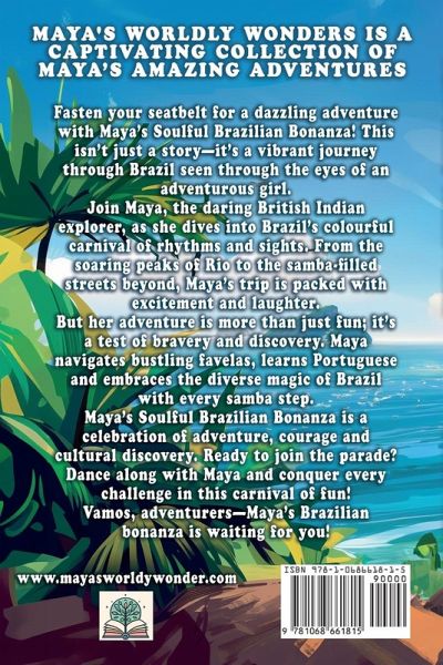 Fasten your seatbelt for a samba of a story with Maya's Soulful Brazilian Bonanza! Meet Maya, a spirited Indian girl with an adventurous heart and bravery that rivals a lion's roar. Travel with her as she dives into the soul of each destination, from the bustling streets of London to the vibrant alleys of Brazil. Why You'll Love Maya's Adventures:Inspire Young Explorers: Maya's curiosity and bold spirit ignite the adventurer in every reader. Cultural Immersion: Forget typical tourist trails. Maya forges deep connections with locals and unravels hidden secrets. Life Lessons in Fun: Learn resilience, empathy, and the joy of stepping out of comfort zones. Sensory Delight: From spicy cuisines to rhythmic dances, Maya's experiences will tantalize your senses. Empowerment: Face challenges with confidence and humor, just like Maya. What Awaits Your Child: Iconic Landmarks: Scale the Christ the Redeemer statue for breathtaking views and marvel at the natural wonder of Iguazu Falls. Favela Explorations: Discover colorful communities and forge friendships in Rio's heart. Coastal Charms: Explore the stunning north East shores of Brazil and dive into exciting underwater adventures. Give your child the gift of adventure, culture, and learning with Maya's incredible journey through Brazil. Grab your copy now and let the adventures begin!