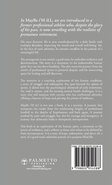 Retired Pro Athlete Battles Mental Health Disorders, Seeks Purpose: A Journey from Sports Stardom to Therapeutic Healing and Self-Discovery. In MayBe i'M iLL, we examine the life of a former professional athlete, a man who once reveled in the glory of sports stardom, now grappling with the harsh realities of early retirement. His once vibrant existence has been replaced by a daily struggle with multiple disorders, affecting his mood and overall quality of life. Yet, despite these challenges, he remains undeterred in his quest for a purposeful existence. Our protagonist is not just a good man; he is a symbol of strength and determination. He is a testament to the human spirit's ability to rise above conflict. The narrative surveils his journey from the pinnacle of professional sports to the depths of personal despair and his relentless pursuit of healing and self-discovery. The narrative is a poignant exploration of the human condition, a tale of struggle and redemption that transcends the realm of sports. It delves into the psychological impact of identity lost, the emptiness it engenders, and the subsequent mental health challenges. It is a story that will resonate with anyone who has ever faced adversity, offering a beacon of hope and a demonstration of the power of resilience. MayBe i'M iLL is more than a book; it is a journey that takes the reader from the dizzying heights of athletic performance to the perpetual pits of pain and back again. It's a voyage marked by agony and suffering, but also by optimism and vindication. It is an excursion that, ultimately, leads to deep introspection and increased self-awareness. This book celebrates tenaciousness and mental fortitude, a tribute to those who refuse to be defined by their circumstances. It is a story of courage, a story of transformation, and above all, a story of a good man's unyielding search of a purposeful life.