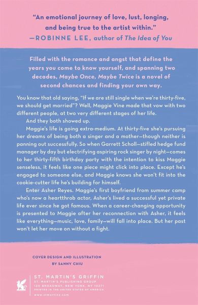 Filled with the romance and angst that defines the years you come to know yourself, with a shifting timeline covering two decades and ratcheting up the tension, Maybe Once, Maybe Twice is a novel of second chances and finding your own way. You know that old saying, "if we are still single when we're 35, we should get married?" Well, Maggie Vine made that vow with two different people, at two very different stages of her life. And they both showed up. Maggie Vine's life is going extra-medium. At 35 she's pursuing her dreams of being a singer and being a mother-though neither is successfully panning out. So when Garrett Scholl-stifled hedge fund manager by day but electrifying aspiring rock singer by night-comes to her 35th birthday party with the intention to kiss Maggie senseless, it feels like one piece might click into place. Except he's engaged to someone else, and Maggie knows she won't fit into the cookie-cutter life he's building for himself. Enter Asher Reyes. Her first boyfriend from summer camp, turned into heartthrob actor, he's lived a successful yet private life ever since he got famous. When a career-changing opportunity is presented to Maggie after her reconnection with Asher, it feels like everything-music, love, family-will fall into place. But her past won't let her move on without a fight.